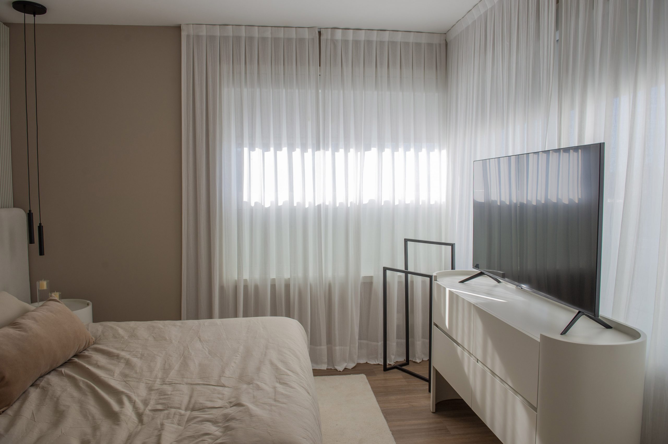 Por delante de la cortina roller, se colocó una cortina tradicional decorativa, que suma textura y calidez al ambiente, aportando un toque más acogedor sin comprometer la funcionalidad del sistema motorizado.